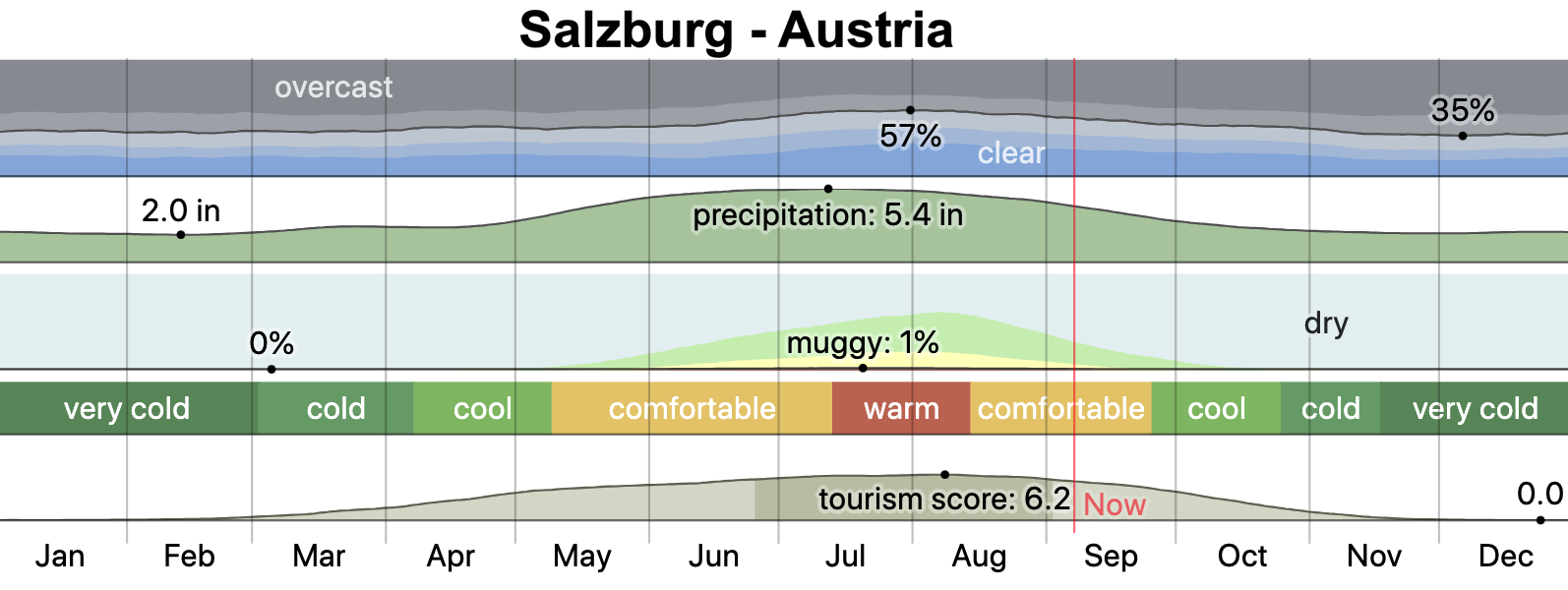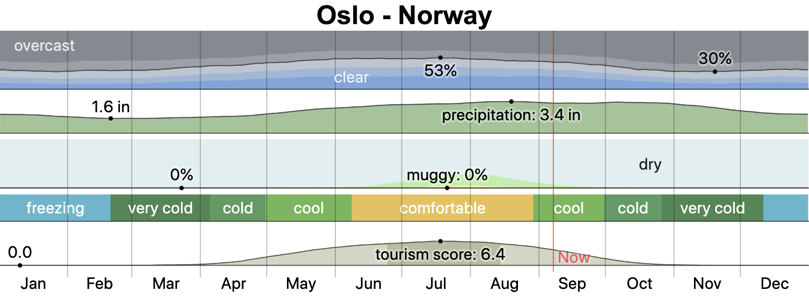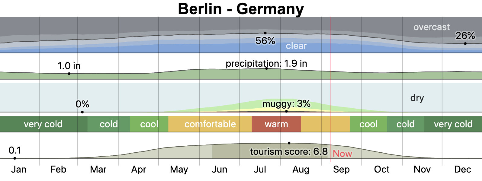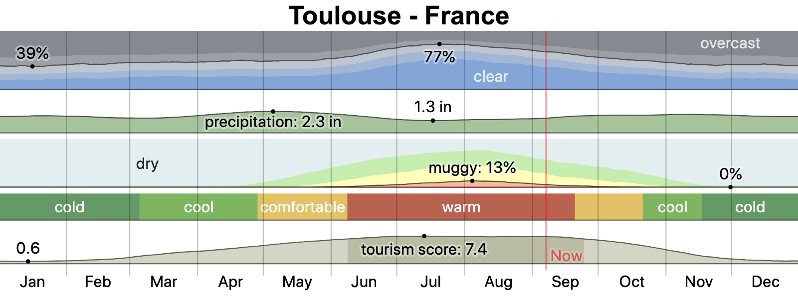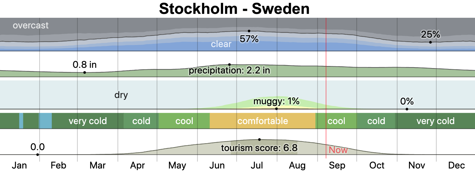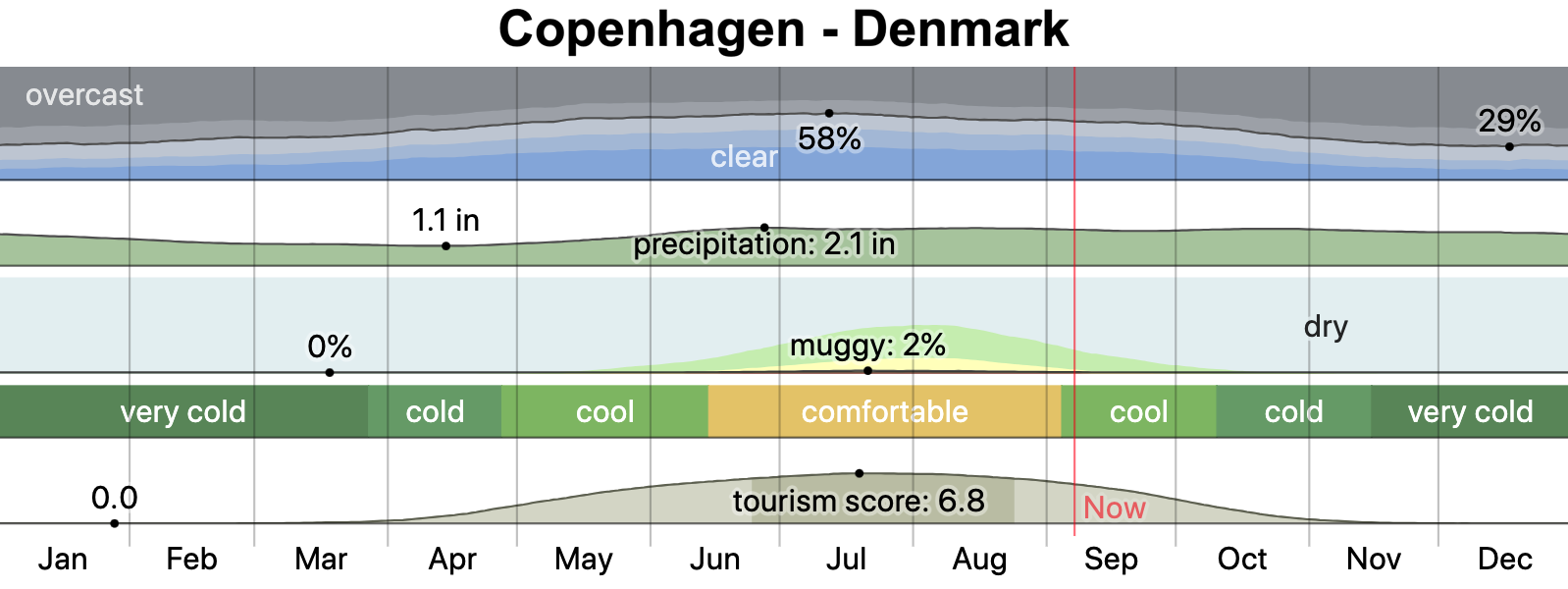 To make the right decision concerning the date of your tour, we have added a combination graph that shows temperature, rain, cloud-cover, etc for a number of regions in Europe. The further down, the further north, the colder.
