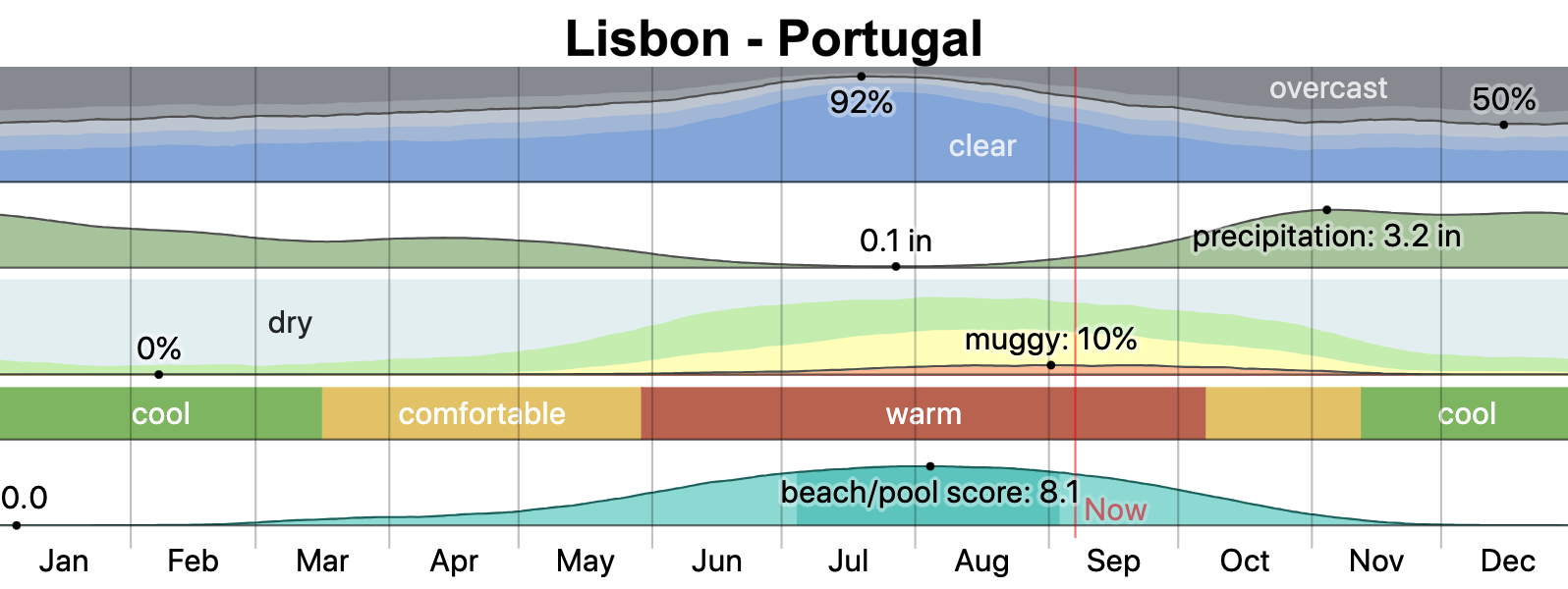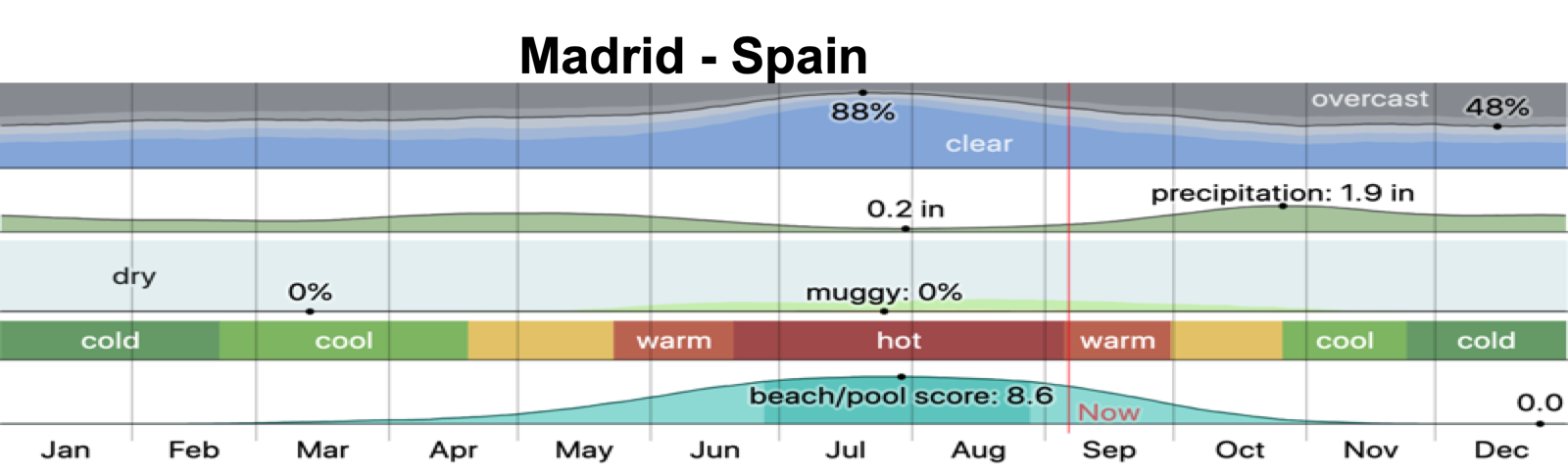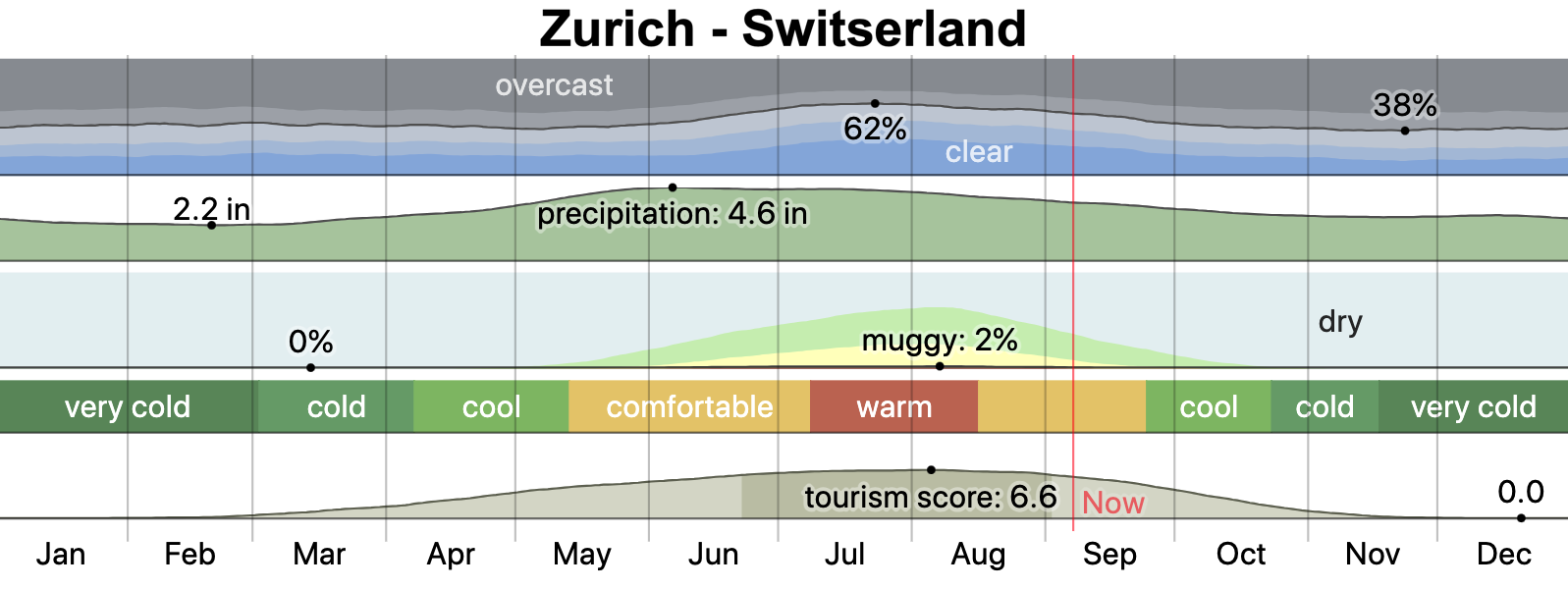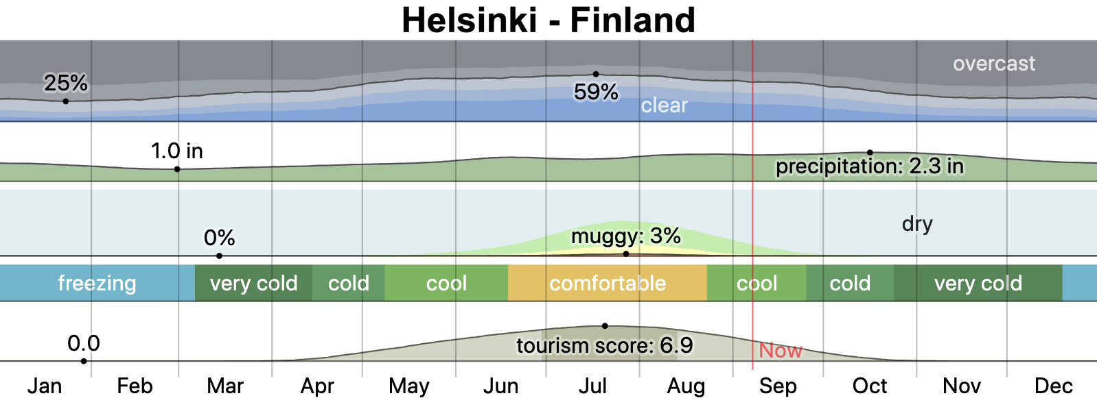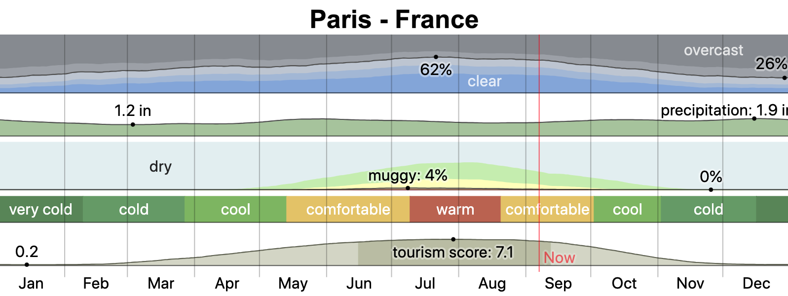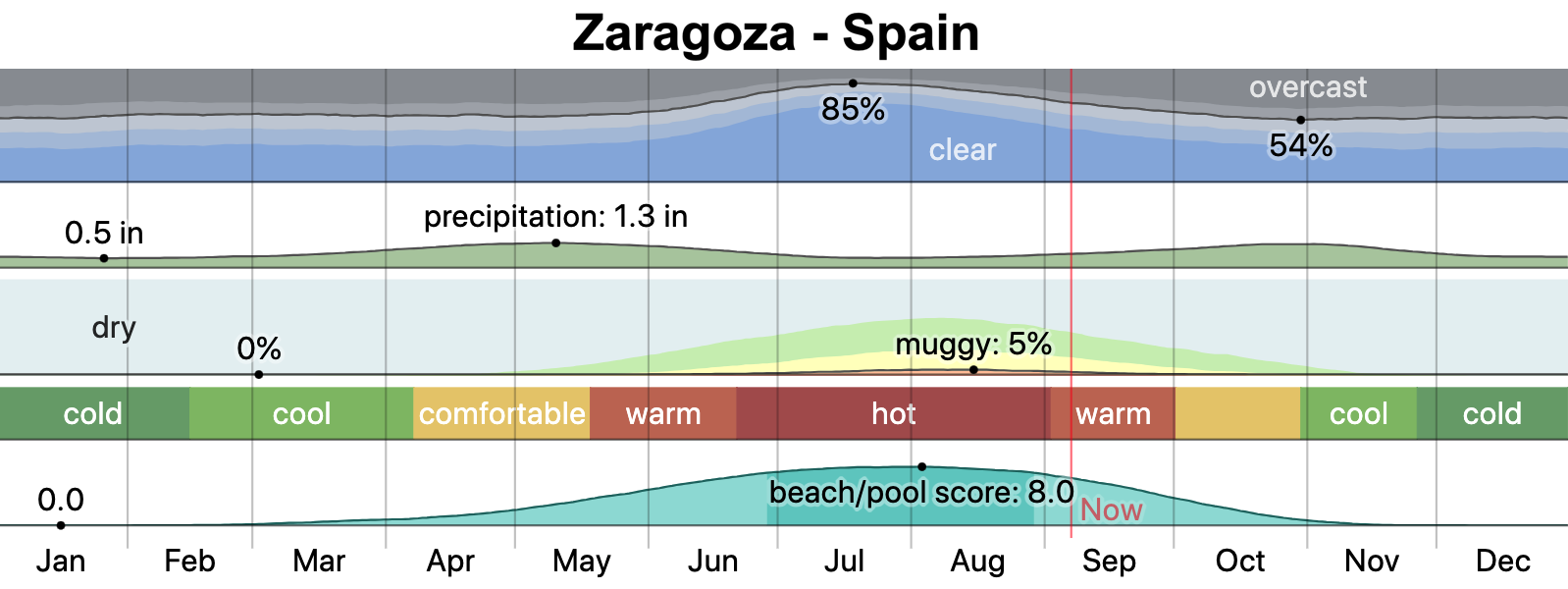 To make the right decision concerning the date of your tour, we have added a combination graph that shows temperature, rain, cloud-cover, etc for a number of regions in Europe. The further down, the further north, the colder.