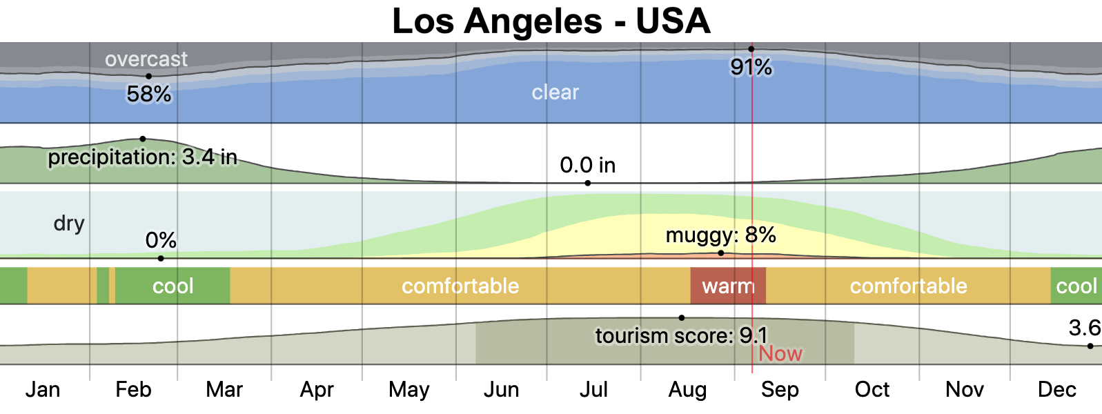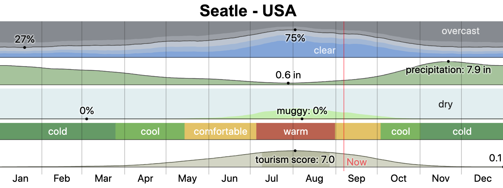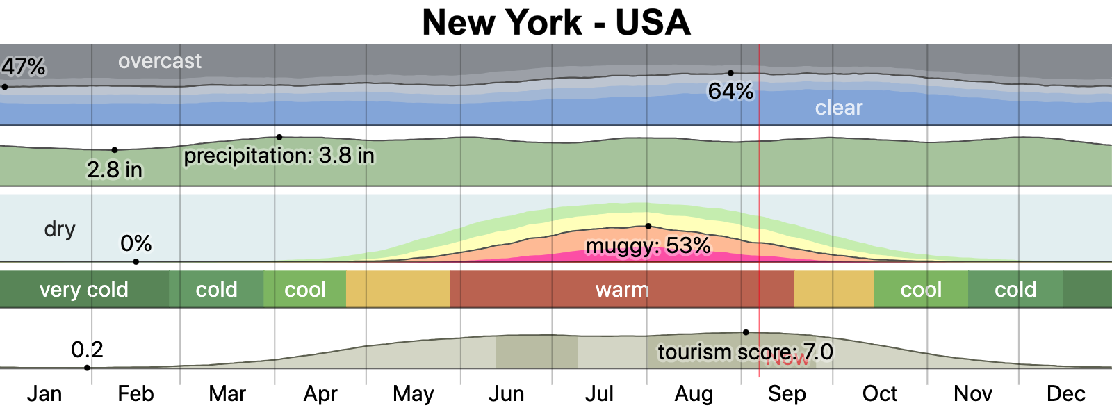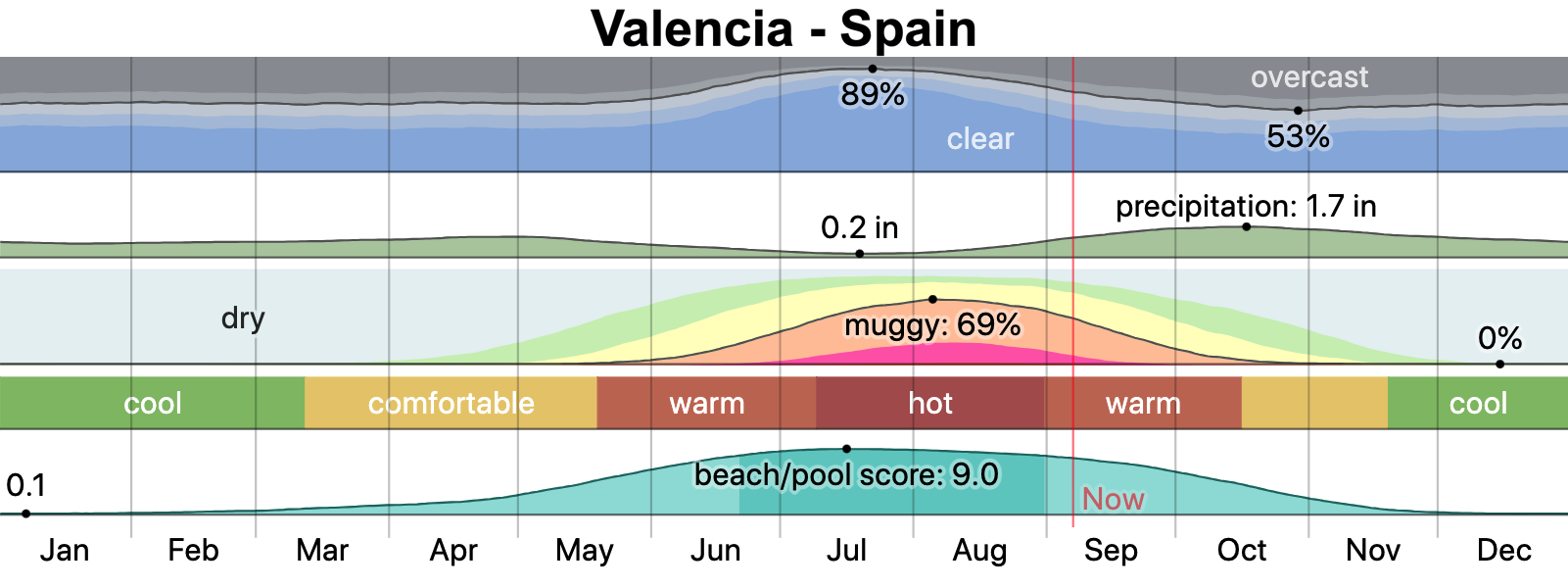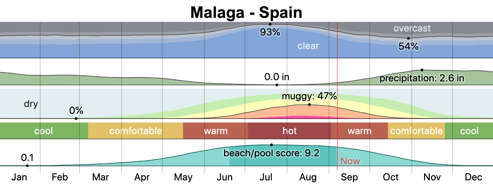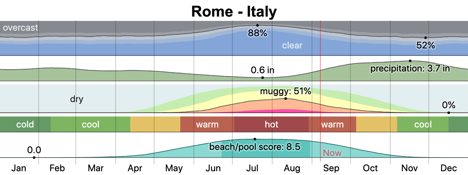 To make the right decision concerning the date of your tour, we have added a combination graph that shows temperature, rain, cloud-cover, etc for a number of regions in Europe. The further down, the further north, the colder.
